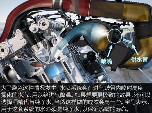 在已知这种情况发生的情况下,宝马和博世联手,创造性地在进风口位置安装了喷水嘴。从图中还可以清楚地看到,在进气口的位置有一根蓝色的小水管,通过喷嘴将水准确地喷入进气管,然后直接进入发动机的燃烧室。当然,水的量是相当少的。如果过多,会对发动机的功率产生一定的影响。发动机的冲击甚至可能使发动机报废。